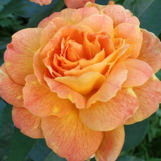 Кусты вытянутые, широкие (около 1 м) и прямостоячие. В высоту они достигают 90 – 150 см. Прочные побеги густо покрыты глянцевыми, темно-зелеными листьями. На каждом стебле образуется по 1 – 3 бутона. Распускаясь, они образуют пышные, среднекрупные (шириной 11 – 13 см) цветки. Лепестков много – до 80 штук. Окрашены они в ярко-оранжевый цвет. Цветение начинается в июне и длится вплоть до октября. Аромат насыщенный, пряный, но не навязчивый.